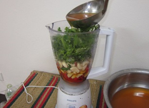 และผักชีปั่นในเครื่องปั่น ใส่เครื่องน้ำปรุงลงไปปั่นรวมกัน แบ่งปั่นเป็น 2 รอบ จะไม่หนักเครื่องจนเกินไป