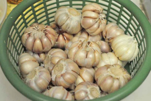 1. ถ้าได้กระเทียมมาเป็นพวง ให้ตัดออกเป็นหัวลอกเปลือกออกบางส่วน แล้วนำกระเทียมใส่ไว้